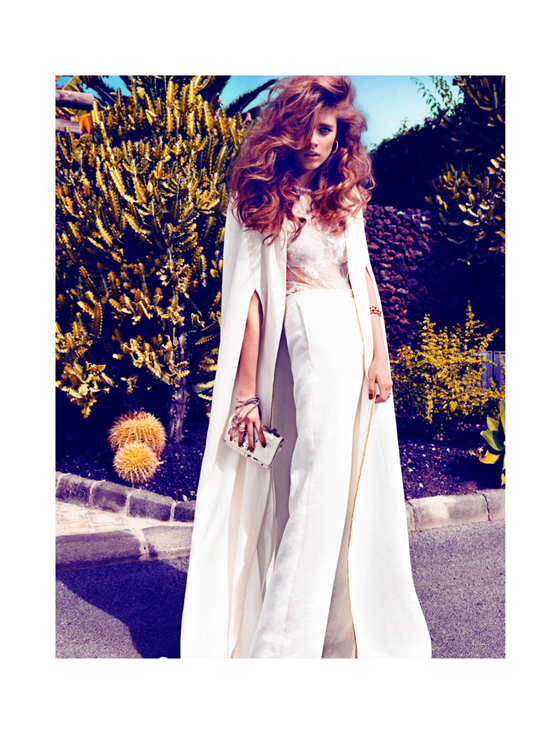 Questo editoriale, che sarà sullo speciale Sposa di Vogue Spagna, vede un nuovo modo di concepire l’abito nuziale: abiti lunghi dal taglio dritto, pantaloni a vita alta abbinati a top trasparenti di pizzo e mantella lunga, ma anche accessori colorati e uno smalto rosso scuro, perché no. La modella Beegee Margenyte è strepitosa in queste foto realizzate dal duo Hunter & Gatti, che proprio di recente ha realizzato l’adv campaign per Guess by Marciano. C’è più di un look che mi piacerebbe copiare, per non parlare dello stile di capelli e make-up: il primo realizzato dall’hair stylist Paco Garrigues,il secondo dal makeup artist Frank Garret.
