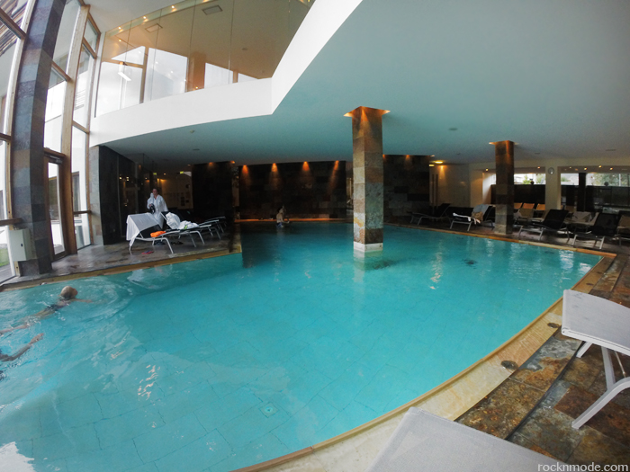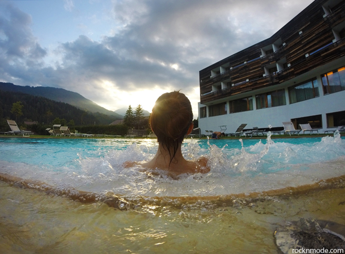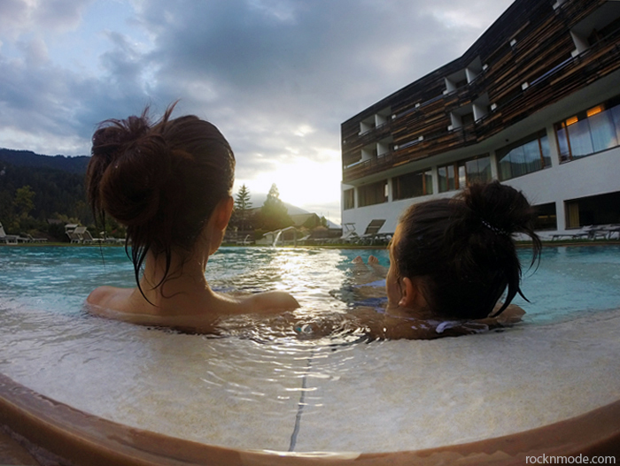 Anche nell’Acquapura Spa (2400 mq di relax e benessere) le possibilità sembrano infinite: sauna finlandese, cabine a infrarossi, enorme vasca idromassaggio, bagno turco, lettini ad acqua, vasca Kneipp, sala di riposo panoramica e bio-sauna della valle Gailtal. Noi, però, abbiamo sempre preferito fare le paperelle in ammollo tra la piscina interna e la piscina esterna riscaldata, dove potevamo ammirare il panorama al tramonto durante l’idromassaggio. Una famiglia di romantici.
