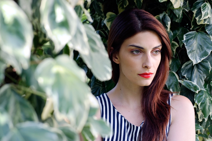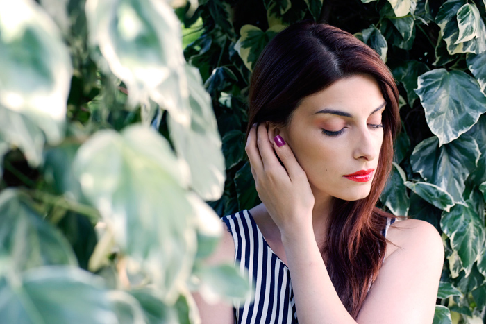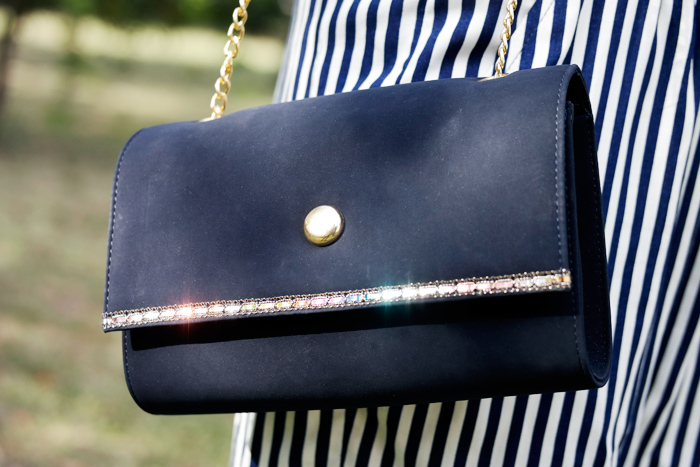 Home Looks Outfit – Mini jumpsuit a righe e clutch vintage