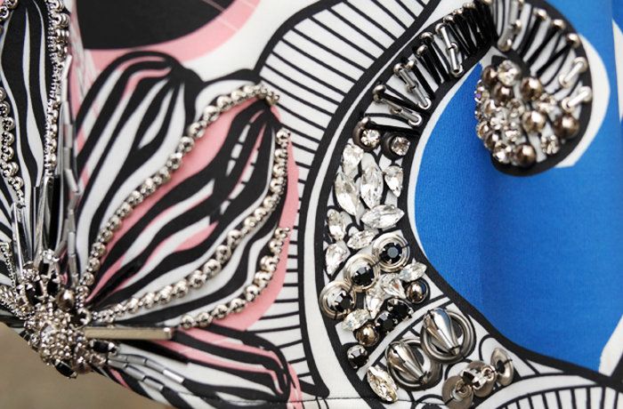 Oggi vi mostro uno degli outfit della mia brevissima (ma intensa) settimana della moda milanese, indossato per la sfilata di Roberto Cavalli. Il pezzo forte è sicuramente la gonna, un pezzo della collezione autunno inverno 2014/15 di Cristina Miraldi che mi ha subito colpito per la particolarità della trama, un disegno speculare metà astratto, metà floreale. L’ho abbinata a una camicia bianca plissettata sul davanti, con le spalline leggermente a sbuffo, semplice ma molto femminile.
