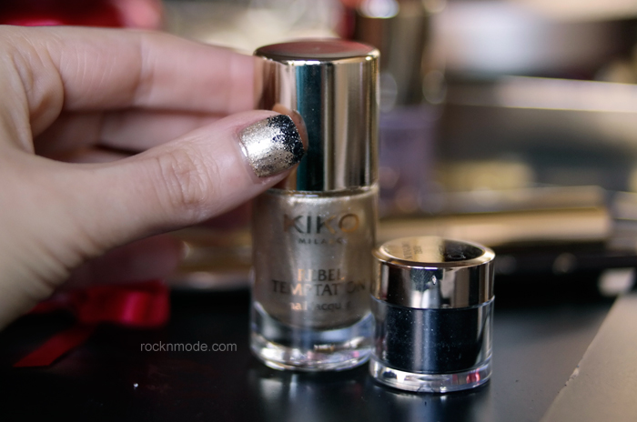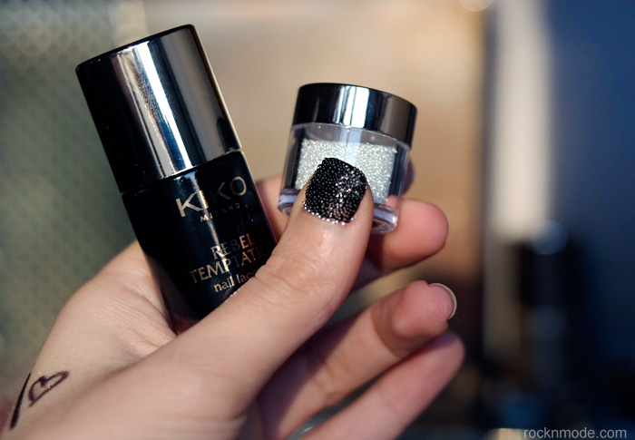 Alcune idee carine, last minute e low cost, puoi trovarle tra le proposte Kiko, collezione Haute Punk. Il kit che più mi ha entusiasmato è Rebel Temptation, che contiene uno smalto nero, uno dorato, un flaconcino di polvere glitter nera e un flaconcino di microperle trasparenti, più un pennellino. Realizzare le due proposte che trovi nel post (una in alto, l’altra nella gallery) è stato piuttosto facile, ma ricorda di mettere un piattino ulteriore (oltre quello in dotazione) per raccogliere le microperle, altrimenti te le ritroverai per tutta casa. (come faccio a saperlo? 😀 Ehm…)