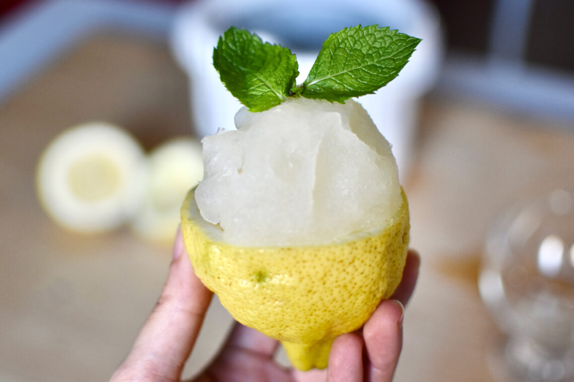 Io ho servito il sorbetto all’interno della buccia del limone stesso, che avevo precedentemente inserito nel congelatore. Non ho usato topping o granelle per decorare, ma ho solo aggiunto una foglia di menta. Provate! 🙂