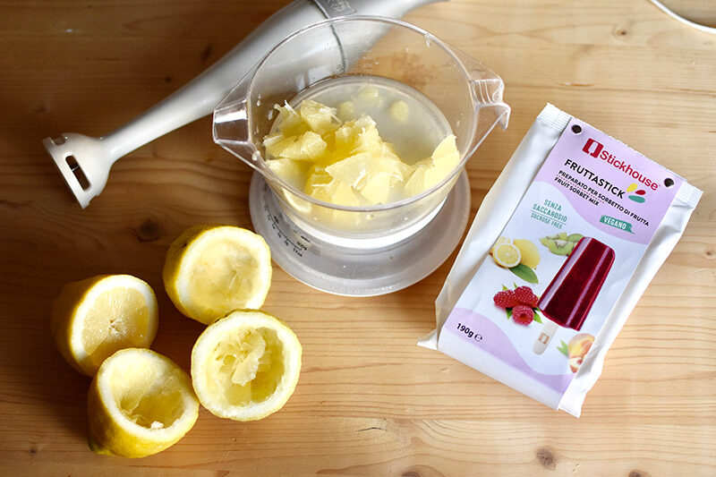 2. Unisci la base per sorbetti di frutta “Fruttastick” con la purea di frutta e l’acqua tenendo conto della tabella che trovi sul sito. Mescola bene